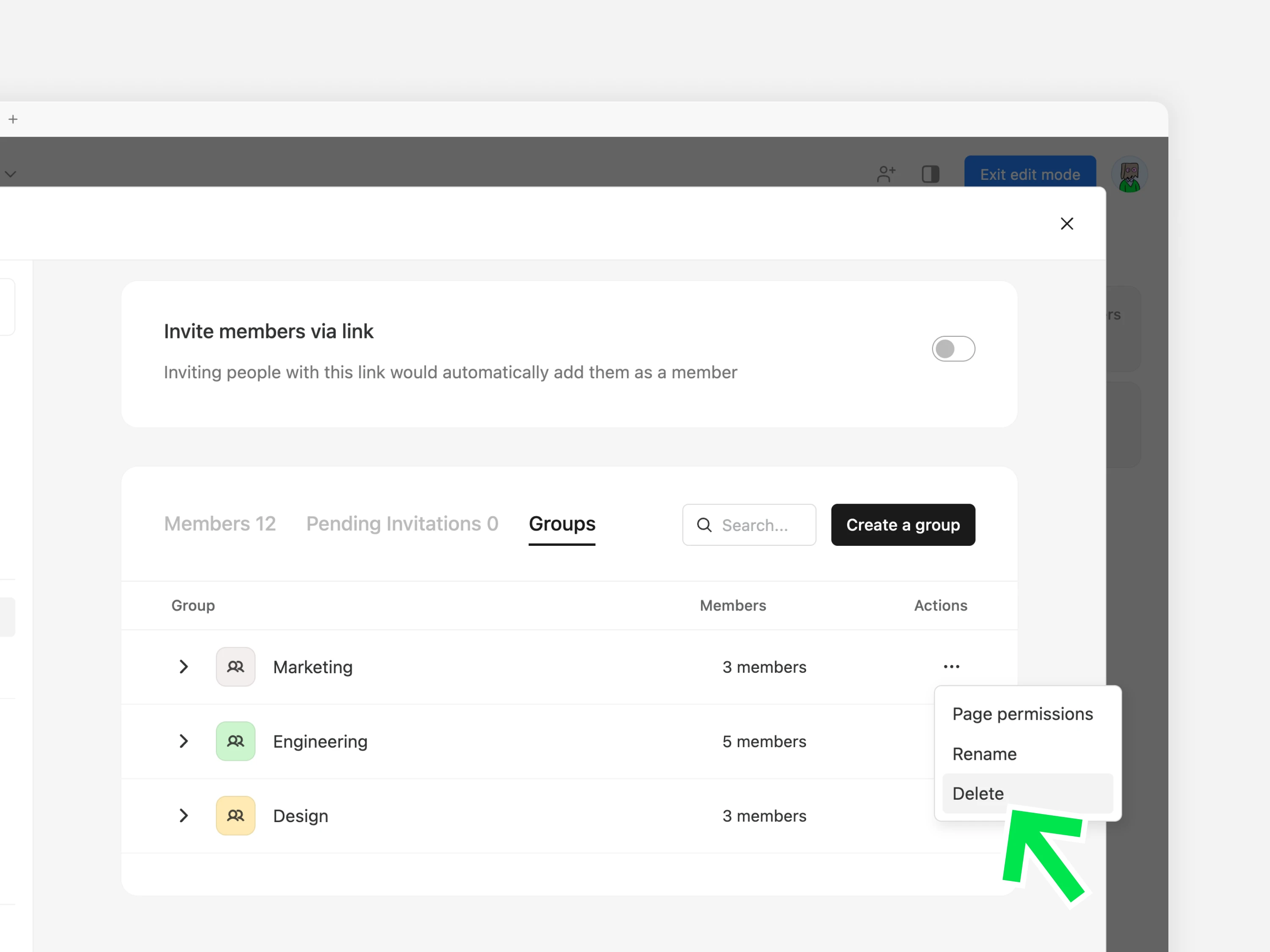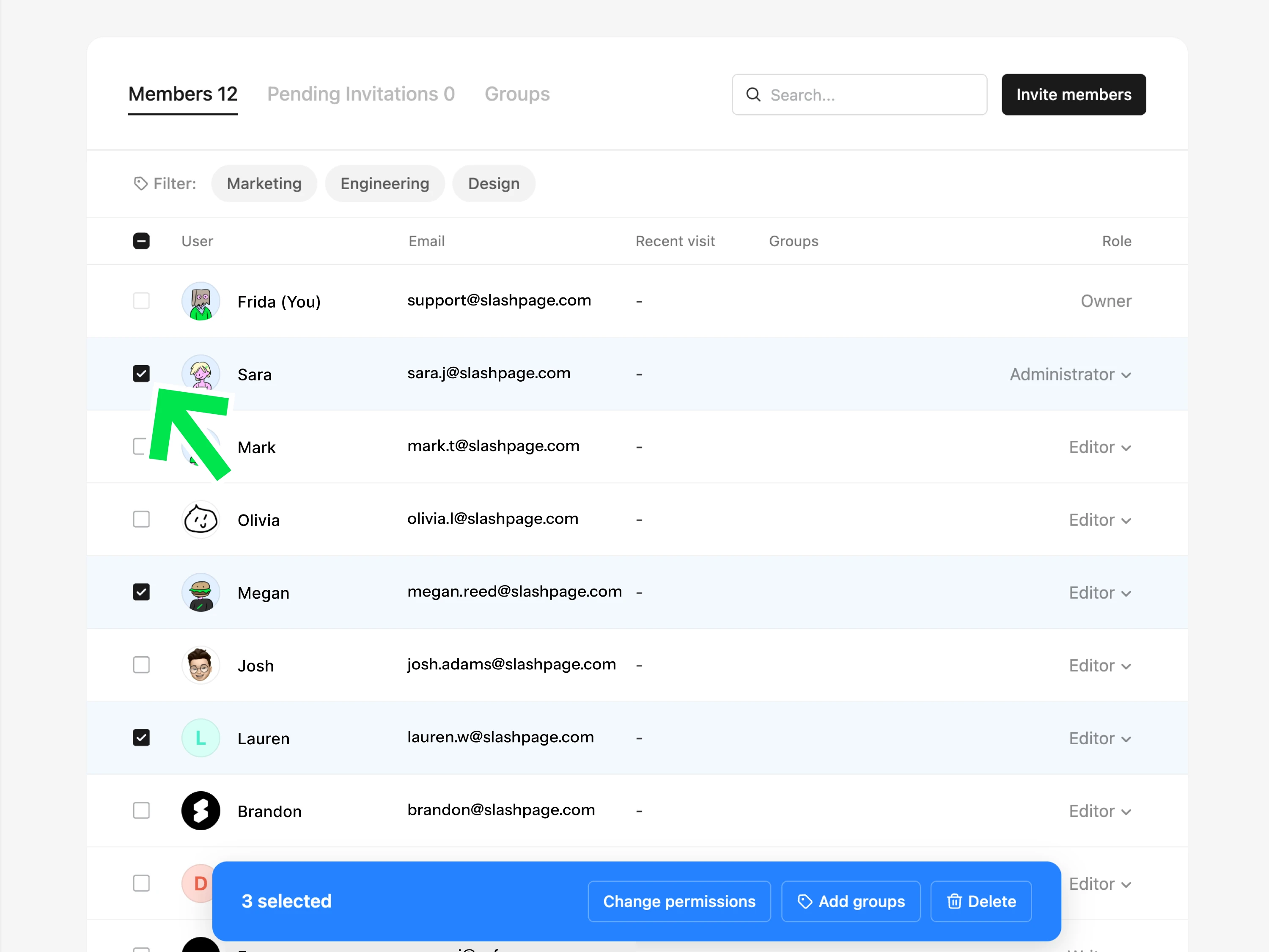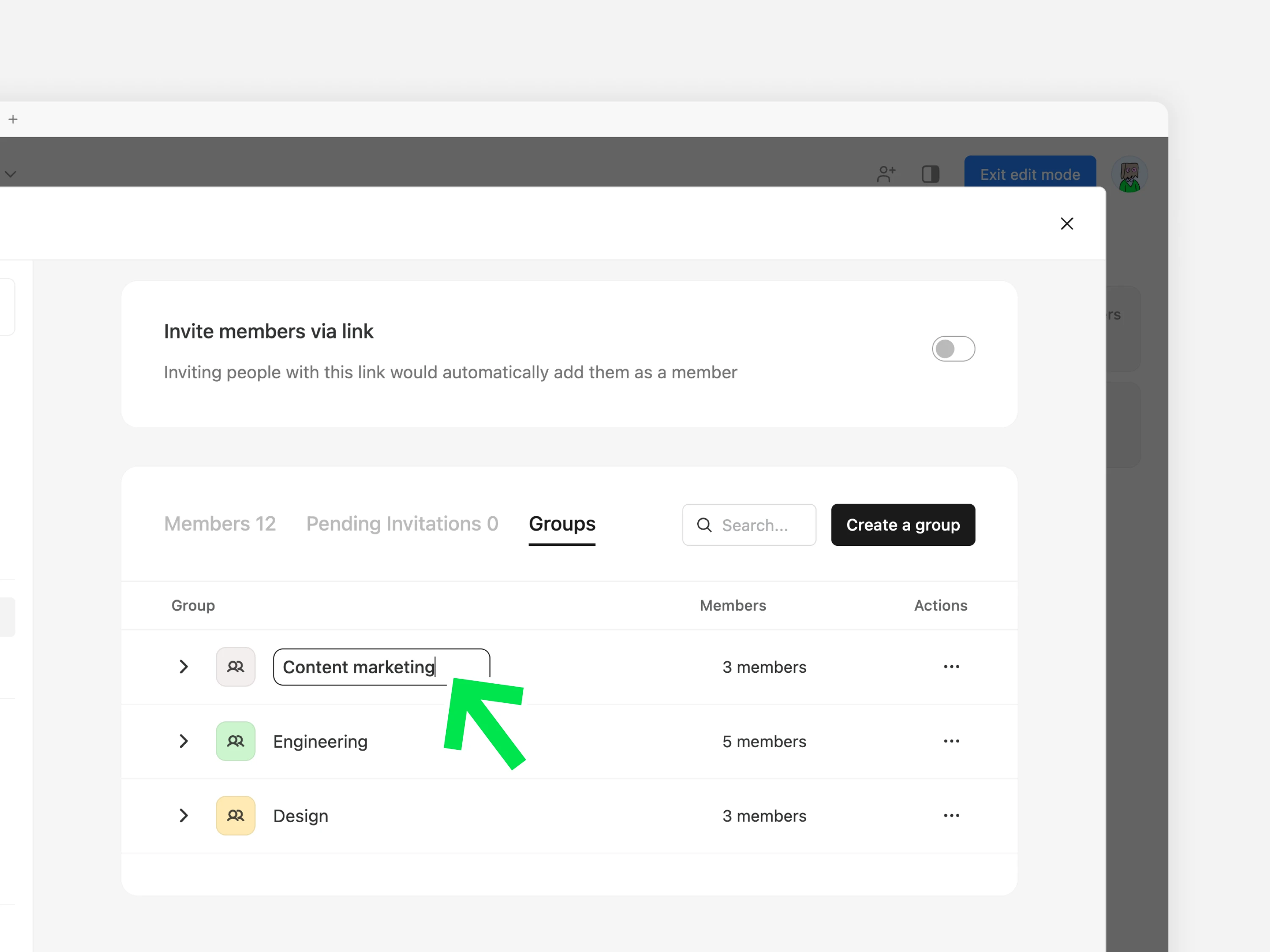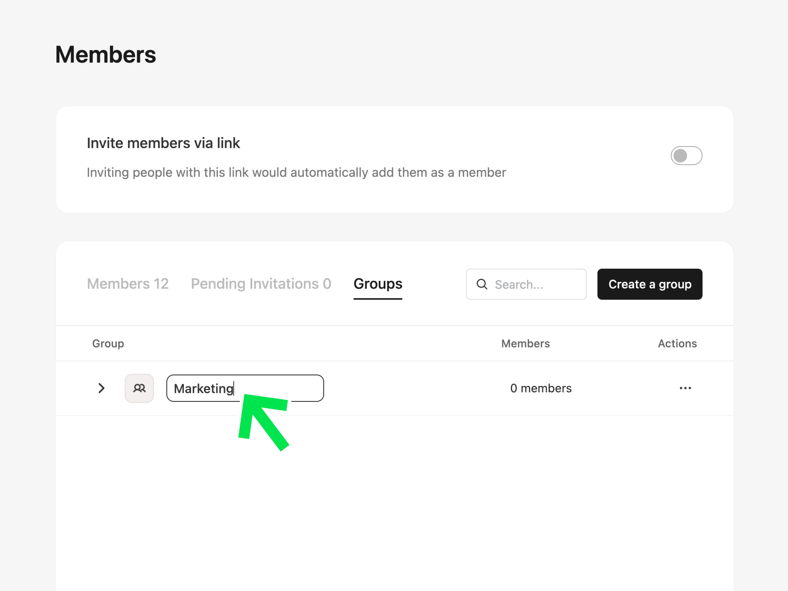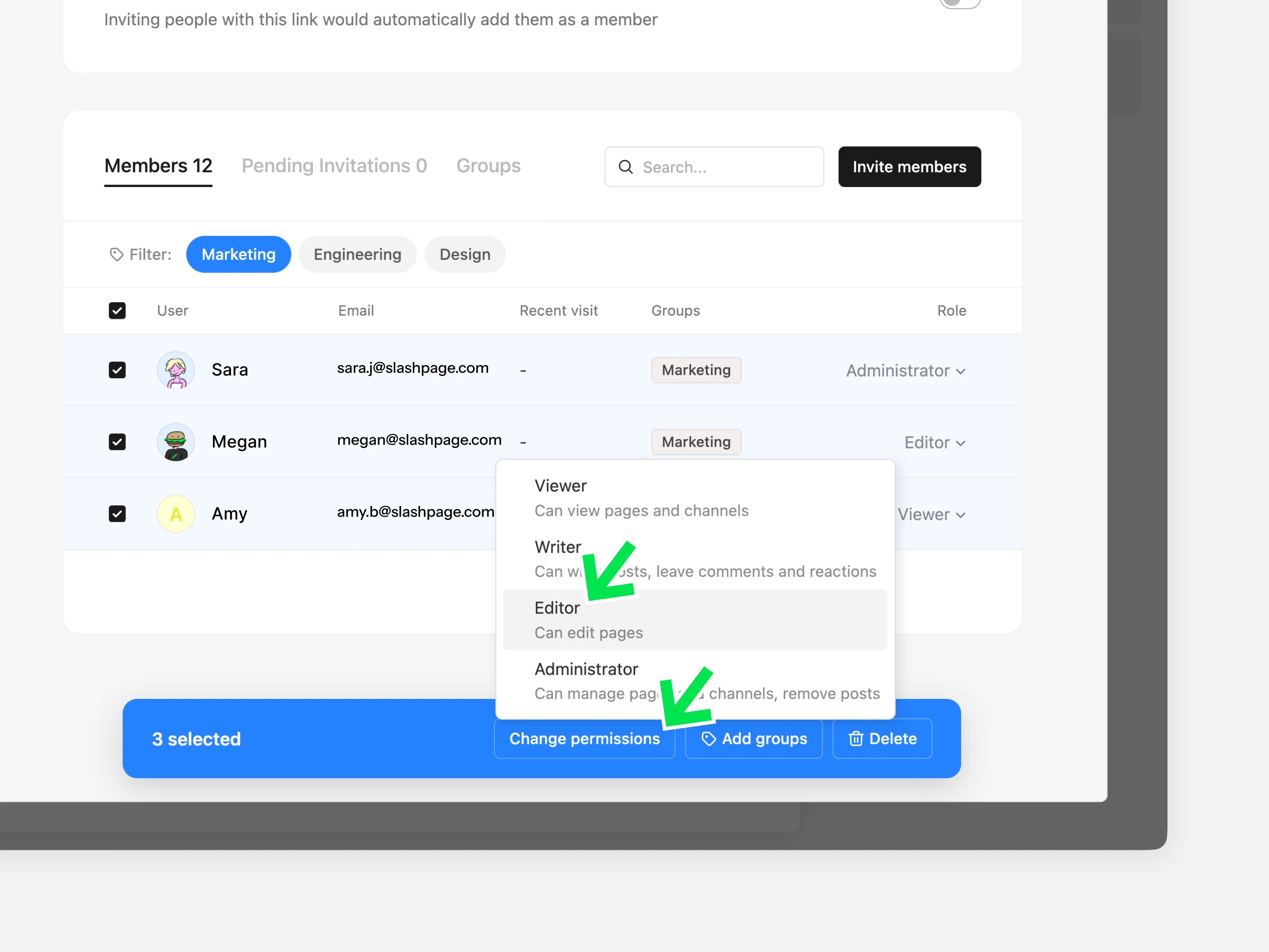 그룹으로 멤버를 구분하고, 여러 멤버에게 일괄적으로 권한을 부여하거나 페이지 및 채널에 초대합니다.