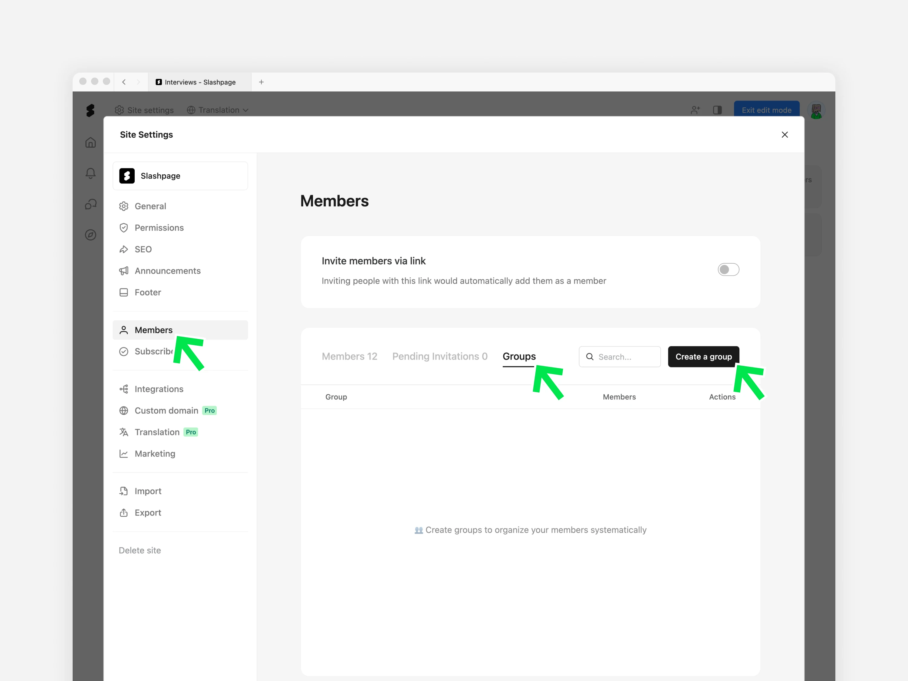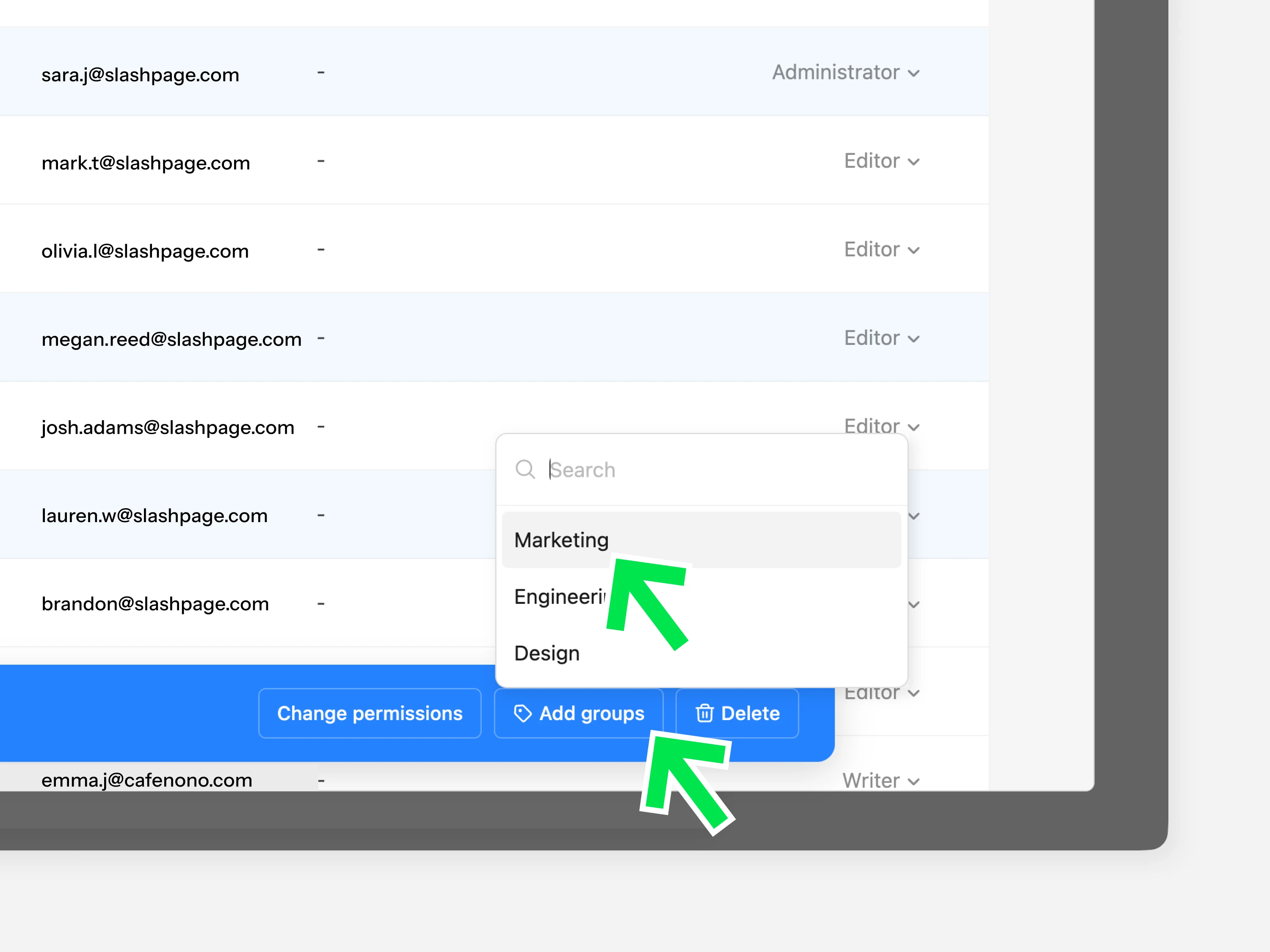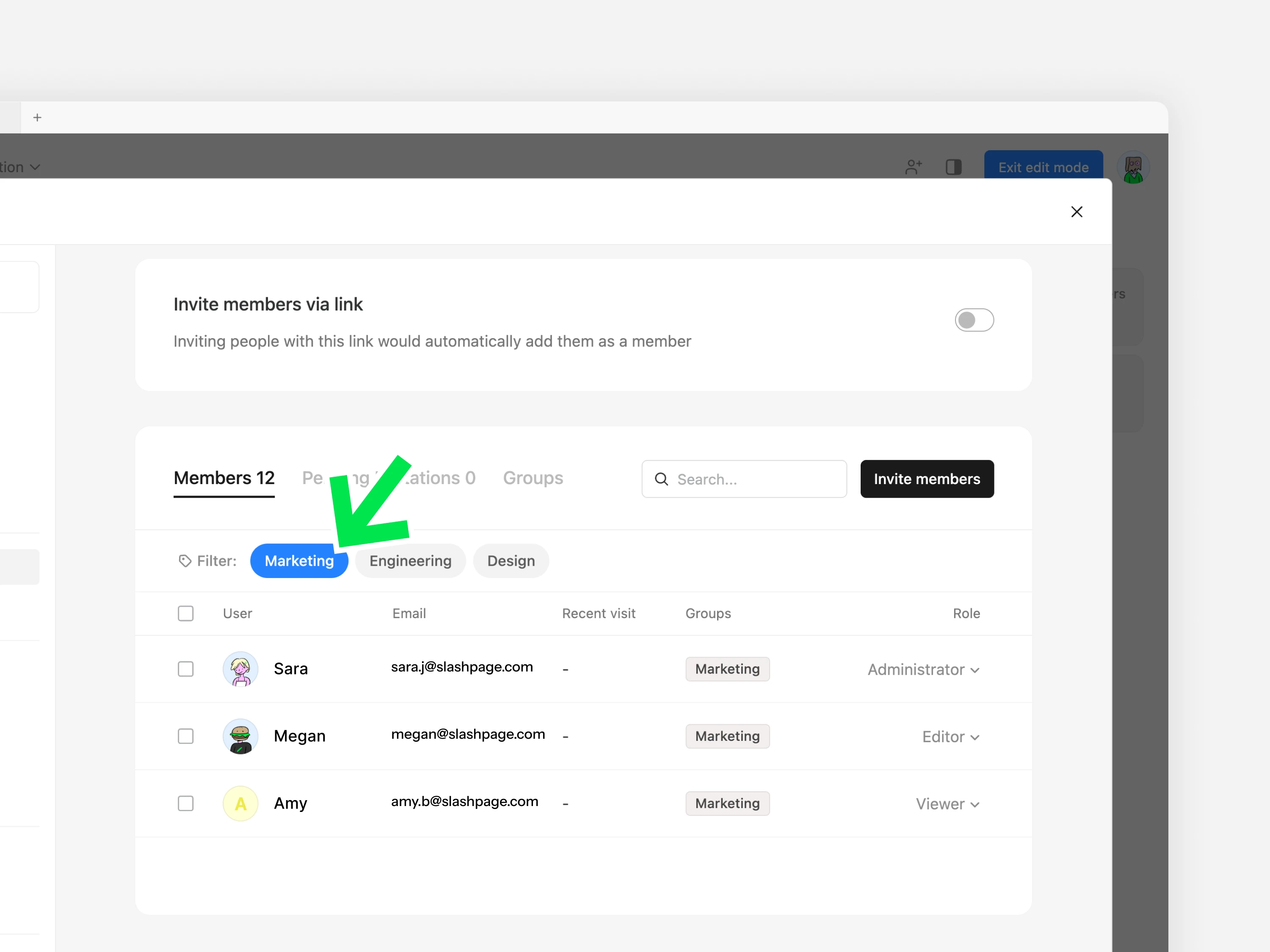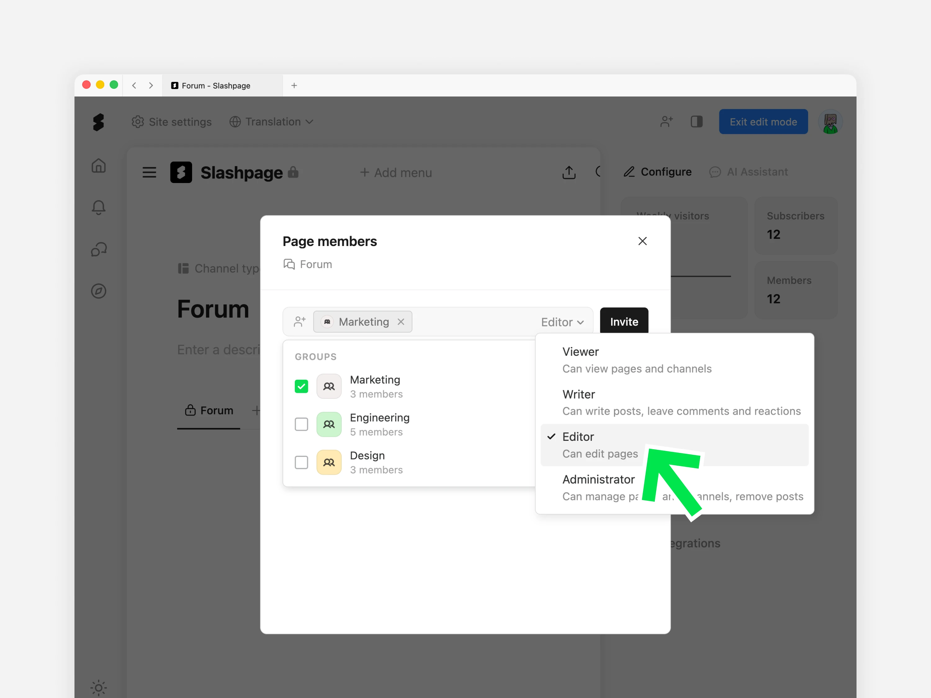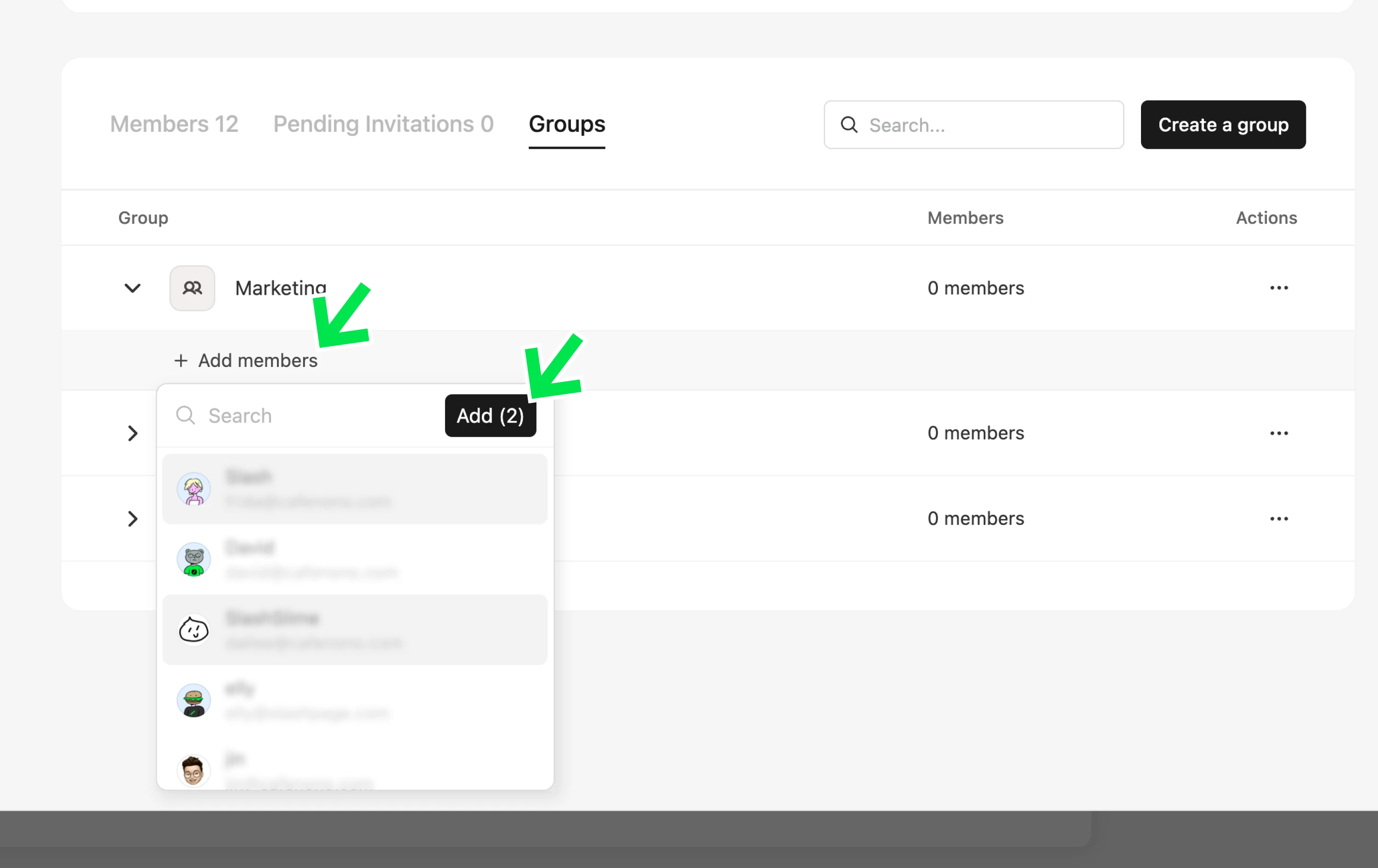 그룹으로 멤버를 구분하고, 여러 멤버에게 일괄적으로 권한을 부여하거나 페이지 및 채널에 초대합니다.