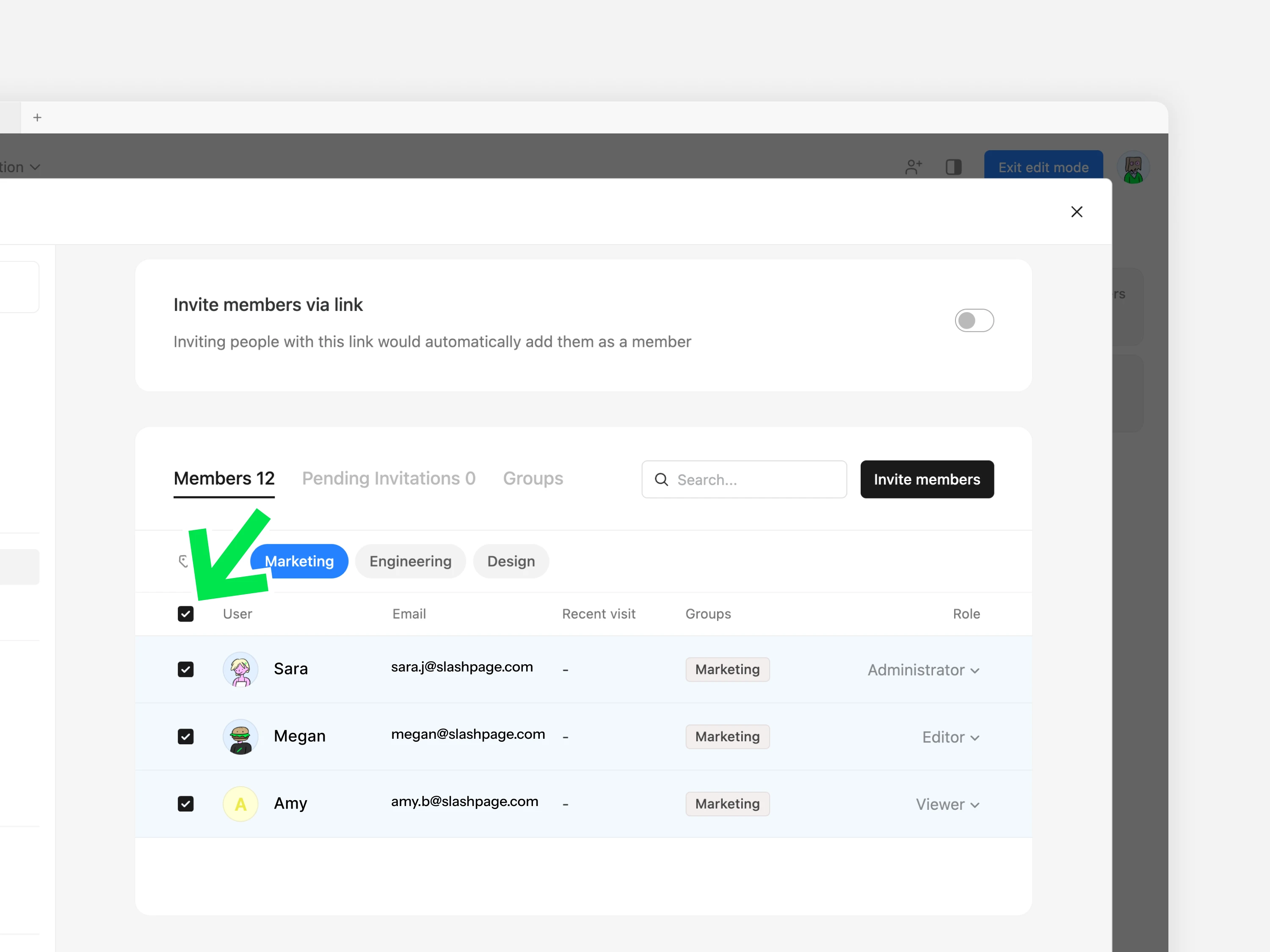 필터링된 멤버 목록에서 전체 선택 체크박스를 클릭합니다.