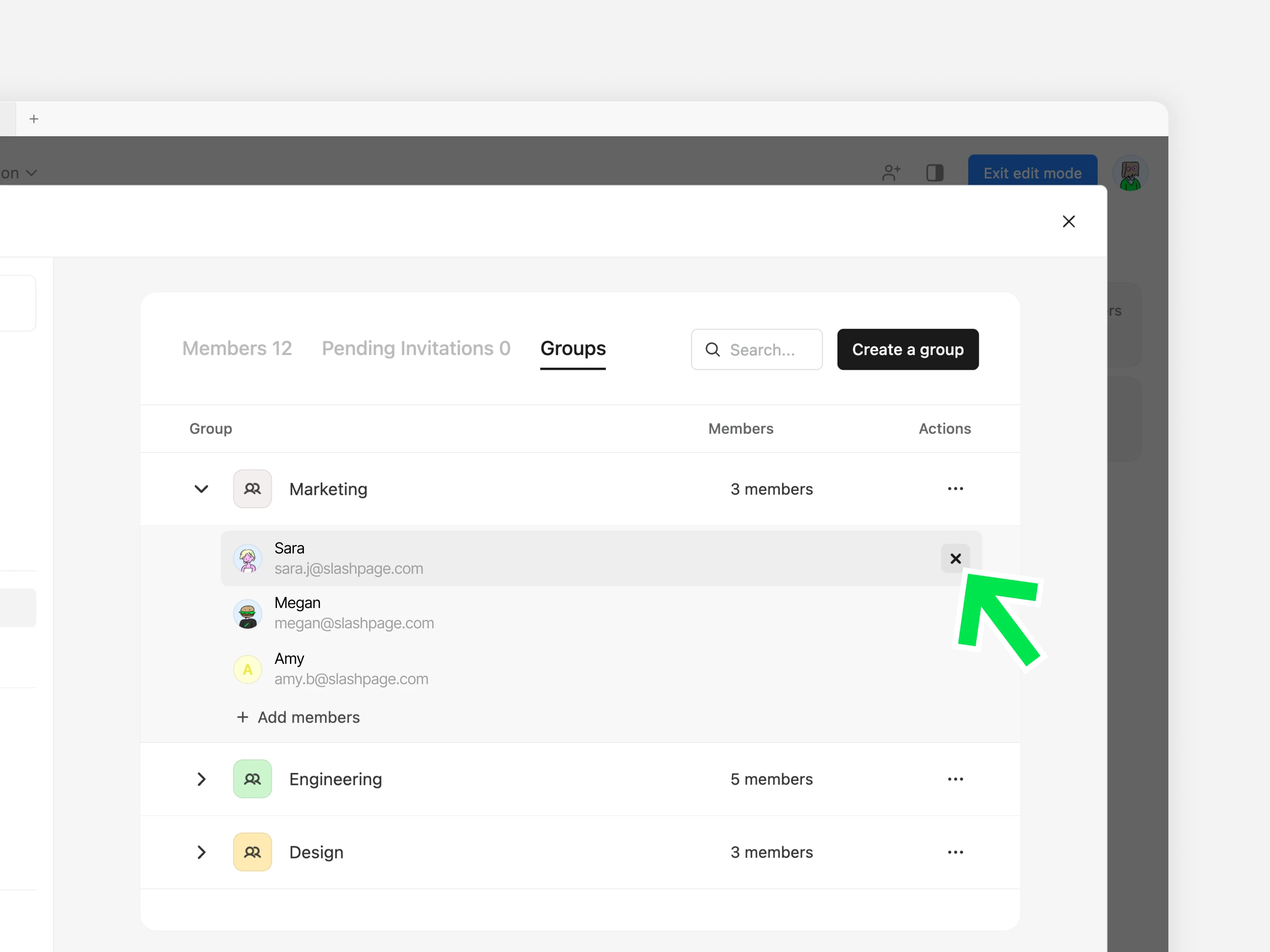 탭에서 삭제할 멤버가 있는 그룹을 열고, 멤버 행에 커서를 올리면 나타나는