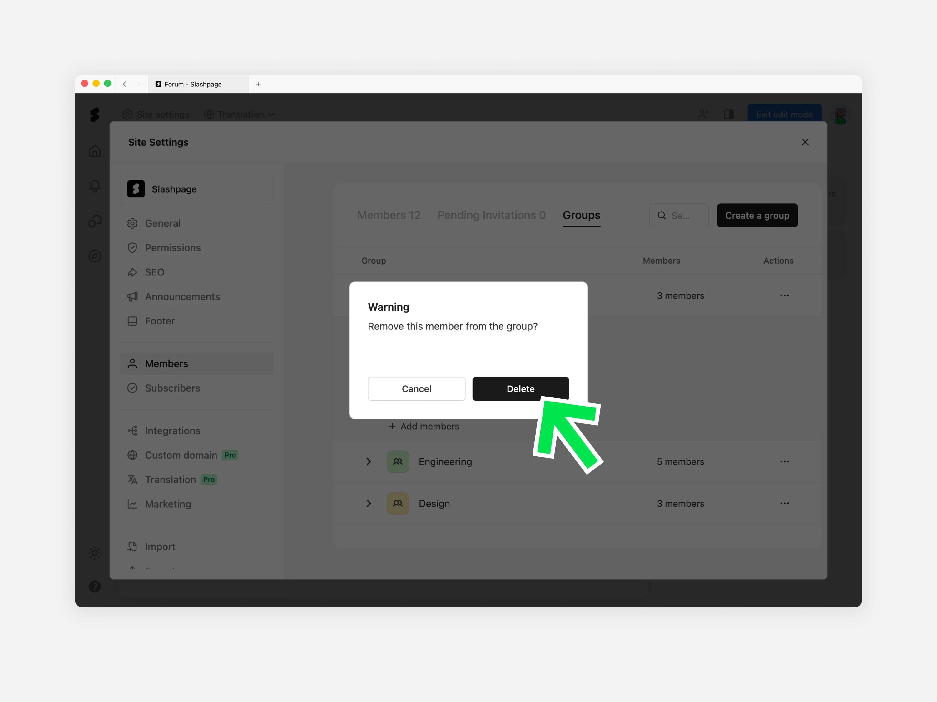 를 한 번 더 클릭하면 그룹 삭제가 완료됩니다. 그룹이 없어져도 해당 그룹에 속해있던 멤버들은 사이트에 그대로 유지됩니다.