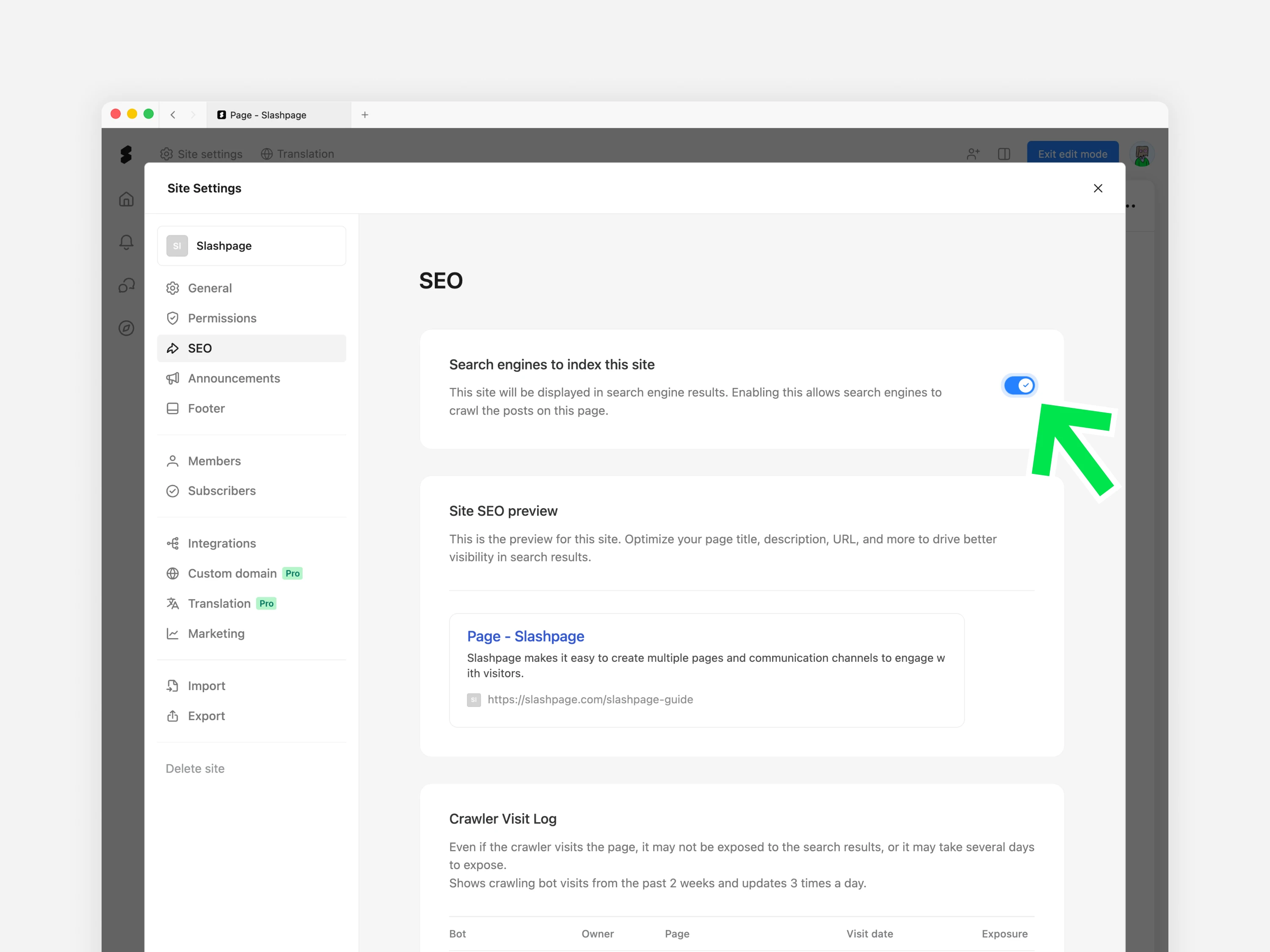 옵션의 토글을 클릭하여 활성화합니다. 이제 사이트 내의 비공개 페이지 혹은 비공개 채널을 제외한 모든 페이지와 채널이 검색 엔진에 공유되며, 사이트맵도 자동으로 제출됩니다.